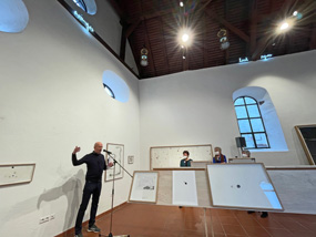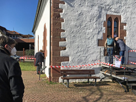 Es ist derzeit nicht absehbar, wie lange wir noch in dieser Situation sein werden und wie auch die Notwendigkeit zur Flexibilität ein fester Bestandteil unseres Lebens werden. „Ich als Künstlerin bin in eine Situation geworfen, bei der die Ausstellungsbedingungen auch für alle weiteren Beteiligten: das Kunstforum, den Redner und das Publikum nicht klar absehbar sind. So habe ich entschieden den Umbau zum Programm zu machen und auf die sich hoffentlich positiv verändernde Situation auch während der laufenden Ausstellung zu reagieren.“ Ein Blick von Außen war von der Künstlerin von anfang an geplant. Als provisorischer Anbau an der Kapelle wurden Treppen angebracht, so dass auch über die Fenster an Ost- und Südseite in die Kapelle Einsicht genommen werden kann. Der Innenraum der Kapelle ist Montag - Donnerstag 16 - 20 Uhr und Freitag - Sonntag 11 - 22 Uhr beleuchtet! ​Zusätzlich ist es unter Hygieneregeln möglich sich die Kapelle öffnen zu lassen. Voranmeldung bei Silvia Tanczos-Lueckge unter Tel. 07033 529733.