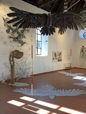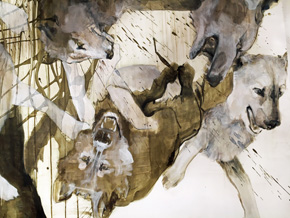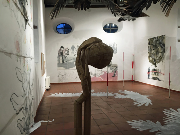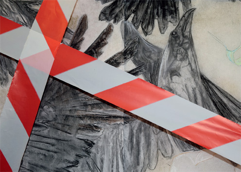 Die Atmosphäre in Tine Schumanns Bildern und Installationen ist konfliktreich und die Szenerie voller Unruhe: Polizisten, Demonstranten, Vögel, Hunde und Wölfe stehen sich gegenüber. Der Mensch ist Tier und verletzliches Wesen in einem fragilen System. Allerdings sucht man in Schumanns sensiblen Zeichnungen vergeblich nach Darstellung offener Gewalt. Eine Bedrohung entsteht aber durch das Fehlen einer eindeutigen inhaltlichen Orientierung oder Geschichte. Berichtet wird vom Leben in der Gesellschaft als permanenten Formungsprozess mit steter Veränderung und Verunsicherung. Szenen werden detailgenau beschrieben, zum Teil höchst impulsiv, mit großer Könnerschaft – man merkt der 1972 in Kirchheim geborenen Künstlerin ihr Studium der Malerei bei Sighard Gille an der HGB Leipzig an, das sie 2007 mit Diplom abschloss – Leipziger Schule! Äußerst versiert zeigt sich Schumann darüberhinaus als Installationskünstlerin: eine seltsame Unruhe beschleicht einem beim Betreten des in allen Dimensionen bespielten Raumes, man sieht sich regelrecht beäugt, überwacht – nachdenklich in diesem erzählfreudigem Geschichtenraum.