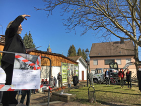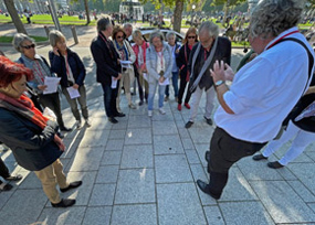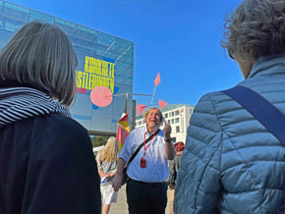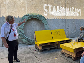 In der Stuttgarter Innenstadt begegnet einem eine Fülle von Skulpturen – vom unübersehbaren Monument (Alexander Calder, *1898-1976, vor dem Kunstgebäude, und Wander Bertoni, *1925, beim Staatstheater) bis zum selbst von alteingesessenen Stuttgartern übersehenen „Miniment“ (Olaf Metzel, *1952, Bolz-/Stauffenbergstrasse). Viele der von namhaften Bildhauern gestalteten Arbeiten widmen sich dem Gedenken an historische Personen oder Ereignisse (Olaf Metzel, *1952, im Hof des Kunstgebäudes, und Peter Lenk ,*1947, vor dem Stadtpalais - wieder abgebaut!), andere kommentieren als „Urban Art“ ihr städtisch-architektonisches Umfeld (Anja Luithle,*1968, auf einer Ballustrade am Haus der Geschichte). Der Rundgang rund um Karlsplatz, Schlossplatz und Schlossgarten bis zur Staatsgalerie, Musikhochschule und Stadtpalais setzte sich mit Auftragsgeschichte, Künstler und formaler Gestaltung von 11 ausgesuchten Skulpturen auseinander und versuchte deren unterschiedliche Wirkungsabsichten zu erschließen. Markus Golser verstand es mit hoher Kennerschaft und in höchst anschaulicher Weise die Kunstspazierer zu begeistern. Er ging am Ende des informativen Kunstspaziergangs am Sockelrest vor dem Stadtpalais sogar auf die Geschichte des wieder abgeräumten "Schwäbischen Laokoons" von Peter Lenk ein und beantwortete auch persönlich gestellte Fragen sachkundig, freimütig und offen.