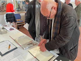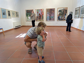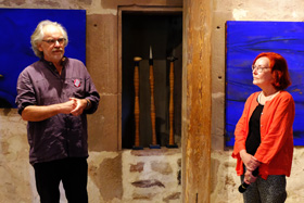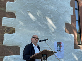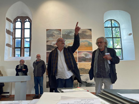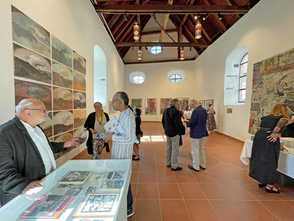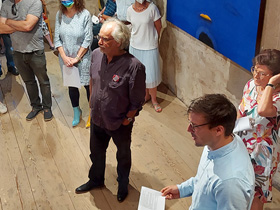 "Wir freuen uns, dass diese für 2020 geplante Ausstellung des Mitbegründers und künstlerischen Kopfs unseres Vereins, Horst Peter Schlotter, nun stattfinden kann“ – so eröffnete 1. Vorsitzende Silvia Tanczos-Lückge die Vernissage vor zulässigen 60 vermummten Besuchern im Steinhaus. Dieser allgemeinen Freude schloss sich auch Bürgermeister Christian Walter an, der schon als BM-Kandidat am 5.7.2020 von Anja Luithles „Tafelrunde“ in Weil begeistert war: „Die Lust ist groß, ohne Kultur wird’s still... das Kunstforum ist eine tolle Institution, auf die die Stadt stolz ist." Im einführenden Gespräch mit der Autorin Irene Ferchl, die Schlotter als „freundschaftliche und wortfindende Begleiterin seit Jahrzehnten“ vorstellte, sprach der Künstler gleich zu Anfang die Probleme beim Bespielen des ehrwürdigen Gemäuers an: „Ich hatte die Idee chronologisch zu hängen, habe aber gleich gemerkt, das geht nicht! Die andere Idee war dann: aus jedem Jahr wenigstens eine Arbeit – aber das habe ich dann auch nicht geschafft“. Ferchl sah im dominierenden Bild „In Stücken in der Zeit treiben“ von 2016 im 1. Obergeschoss, auf Plakat und Einladungskarte abgebildet, alle typischen Elemente Schlotterscher Arbeiten: „Dinge oder Undinge, Schalen, Köpfe, Naturprodukte... es können erkennbare Dinge sein, aber auch Bewegungselemente, die eine große Rolle spielen.“ In einem der ausliegenden Kataloge („Bilder im ersten Jahrzehnt 2000-2010“) war ihre treffende sensible Analyse seines Schaffens zu finden: „Man muss nicht eigens betonen, dass die Gegenstände für Horst Peter Schlotter nicht Selbstzweck sind, sondern er sie zum Anlass nimmt, Farben und Formen zu erproben, lustvoll mit ihnen zu spielen, sie in Bewegung zu versetzen oder zum Innehalten zu zwingen – und sie ein Eigenleben entfalten lässt. Statik und Labilität ist (nun) sein Thema, wie es früher das Wachsen von Pflanzlichem, das Unterwegssein von Gehäusen oder das Strömen von Figuren war ... ‘Eine Art Vorgang’ und voller Dynamik ist selbstverständlich der Prozess des Malens selbst: der Künstler gibt und empfängt bei diesem interaktiven Geschehen. Er erschafft etwas und reagiert wiederum darauf, gestaltet und verändert sich selbst dabei.“ Im Steinhaus wurde ein Videofilm als bleibende Erinnerung an die Ausstellung des Kunstforums und in diesem Zusammenhang auch ein Kurzportrait des Künstlers erstellt. Beide Filme sind auf Youtube zu sehen: https://www.youtube.com/watch?v=udTU0ba7-Qc&t=2s&pp=sAQA https://www.youtube.com/watch?v=0Bo5K-qp6aI&pp=sAQA Ein ‚Schlotter’ ist in Weil der Stadt auch über die Ausstellung hinaus zu erleben: ein Abguss seiner Holzskulptur „Gedanke“. Es ist eines der Kunstwerke von 22 Künstlern, das 2017 auf einem Skulpturenweg unter dem Motto „Hier Brenz! Feuer und Flamme für Reformation“ anlässlich des Reformationsjubiläums vor der Brenzkirche aufgestellt wurde und weiterhin dort seinen hervorragenden Platz hat!