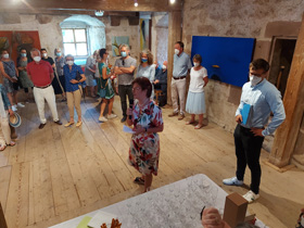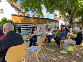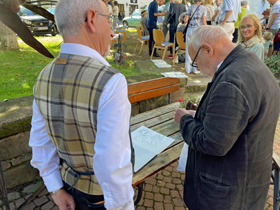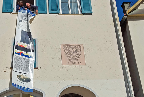 Wir lassen mit ausgewählten Kunstpostkarten auf zwei 4 Meter langen Fahnen die über 600 Künstler (aus 26 Ländern) von unserem „International Mail Art Project Johannes Kepler“ vor genau 25 Jahren jetzt 2021 die Keplerstadt Weil der Stadt zum 450. Geburtstag Keplers grüßen! Kepler und viele Besucher schauen in eine andere Richtung, aber neben jubilierenden Fanfarenstößen und Bar-Lounge-Klängen haben wir unseren Jubiläums-Akzent gesetzt! Vielleicht ergibt sich über solch ein Partnerschaftsfest auch mal eine künstlerische Partnerschaft.