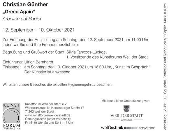 „Ich finde diesen ehemals sakralen Ort ideal, um ein Thema christlicher Ursünde, der „Gier“ (GREED), zu thematisieren“, beurteilte Künstlerkollege Ulrich Bernhard, der in die Ausstellung „Greed again“ einführte, den Ausstellungsort Wendelinskapelle und beantwortete anschließend folgende Frage ausführlich selbst: „Welche Faszination kann ein Film auslösen, damit der Künstler Christian Günther in unzähligen Variationen die Themen und Bildfolgen als Anregung für eigene Kompositionen verwendet?“ „Greed“ ist eine Ikone unter Cineasten. Erich von Stroheim beschrieb 1924 in seinem Stummfilm das Drama eines polternden und brutalen Helden, durch dessen Rohheit und eben maßlose Gier eine scheinbar zivilisierte Welt elendig zusammenbricht. Christian Günther fühlt sich durch die krasse Realistik und präzise Bildsprache des leider verschollenen Films, den er nur durch Standfotos kennenlernte, seit Jahren derart herausgefordert, dass er diesen zeitlos aktuellen Stoff ähnlich besessen immer und immer wieder mit den unterschiedlichsten Techniken als Maler und Zeichner künstlerisch aufgreift – „Greed again“ eben! Form und Inhalt können in Kunstwerken glückliche Verbindungen eingehen – Christian Günther arbeitet sich ganz anders an dem Film „Greed“ von Erich (von) Stroheim ab. „Dass er vornehmlich die Gouache, also sich gegenseitig abstoßende Mittel wie ölhaltige Druckfarben, wassergelöste reine Pigmente, Wachs-, Öl-, Kohle- und Bleistifte verschiedenster Härtegrade, zu seinem Medium entwickelt hat, spricht bereits für den Widerspruchsgeist seiner Werke. Dass er selten ein einziges Motiv wählt und herausstellt, vielmehr auf einen Bogen mehrere Bilder nebeneinander stellt und gegeneinander ausspielt, ist ein weiteres Indiz dafür, dass er nicht die Harmonie, sondern die harten Kontraste sucht.“ (Heinrich Dilly im Katalog „Greed“ der Ausstellung im Amerika Haus Stuttgart 1993). Günther zerreißt diese Geschichten von Gier, jedes Ereignis, alle Zustände lustvoll in viele Bilder, die auf einem einzigen Blatt stehen können und aufeinander antworten.