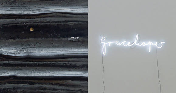 Harald Kröner? In der Financial Times Deutschland vom 4.7.2008 liest man von ihm: „Das ist für mich das Faszinierendste am Zeichnen, dass jeder, der sich zeichnend sein Terrain erobert, gleich auch ein ganzes Universum, eine völlig neue Sprache erfindet. Und dennoch kann jeder diese neue Sprache sofort lesen. Wenn ich in einer Ausstellung einen neuen Zeichner kennenlerne, fühle ich mich oft wie Christoph Kolumbus bei der Entdeckung eines neuen Kontinents. Geistiges Neuland. Und das Kunstwerk wäre dann, um im Bilde zu bleiben – das Ticket für die Reise.“ Da war man ja gespannt, wohin die Reise gehen würde ... „Eine Ausstellung, die vibriert, die Bilder beginnen zu tanzen!“ Diese Aussage einer Besucherin hat den Künstler sichtlich gefreut. Harald Kröner erfreute die Vernissagegäste seinerseits mit einer sehr persönlichen lebendigen Einführungsrede, die seine nicht jedem sich gleich erschließende ungegenständliche Arbeitsweise plausibel beleuchtete und seine Ideen - auch Anregungen aus einem längeren Japanaufenthalt - verständlich vorstellte. Zunächst allerdings erzählte er von James Joyces Nacherzählung der urkomischen Fabel THE ONDT AND THE GRACEHOPER (wortspielerisch für „ Ameise und Heuschrecke“) und dessen Sinn für das Phantastische und phantasievollen Sprachgebrauch. Mit diesem in mehrfacher Weise schillernden Begriff Gracehoper als Neonschrift außen an der Südwand der Kapelle beginnt Harald Kröner seine Gesamtinstallation „Matsushima“. Es ist die Außenschale nach dem Matroschka-Prinzip, das im Inneren weitere Kunst-Schalen bereithält: im Dachbereich über dem ‚White cube’ andere Leuchtschriften mit ähnlicher Bedeutungsspielerei; anschließend die Kapellen-Innenwände mit großformatigen Papierarbeiten; die wiederum umschließen eine weitere Raumschale, die aus 2 sich gegenüber stehenden Pultreihen gebildet wird, auf die viele kleinere Bildnotizen gestellt sind; im Zentrum schließlich auf dem Boden liegend mitten im Raum ein einzelner Objektrahmen mit dem Kopf eines Samuraikäfers. Es ist der einzige gegenständliche Gegenstand der Ausstellung Kröners. Der Künstler hatte dieses geweihartige Objekt zufällig beim Strandspaziergang in Matsushima gefunden. Diese Bucht an der Ostküste gilt ja als Inbegriff japanischer Naturschönheit. Sein sprachloses Staunen über diesen Zufall gleicht dem des japanischen Dichters Basho aus dem 17. Jahrhundert, weswegen Kröner eigentlich nach Japan gereist war. Basho war von der Ausstrahlung des Ortes so überwältigt, dass er einen Haiku verfasste, der nur immer wieder den Namen Matsushima und darauf folgend ein bewunderndes Aaahh! beinhaltet. So könnte auch die Reihe der Papierarbeiten Kröners auf den Pulten verstanden werden. Es sind Versuche von „Tun im Einklang mit dem Wirkprinzip des Seins“, dem Prinzip des Dao: „Wu wie er wie“, ohne Tun handeln, indem man nicht handelt! Kleine, feine ästhetische Ereignisse.