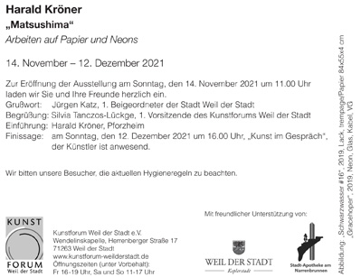 Harald Kröner"Matsushima"14.11.-12.12.2021Der 1962 geborene Pforzheimer Künstler Harald Kröner blickt auf eine rege überregionale Ausstellungstätigkeit zurück, er wird von Galerien in Frankfurt, Ettenheim und Solothurn vertreten, Arbeiten von ihm finden sich in zahlreichen institutionellen und privaten Sammlungen im In- und Ausland. „Prägend für die Kunst von Harald Kröner ist der Wunsch, das Planbare zu überlisten. Alle Welt denkt und handelt nur noch im Rahmen von Projekten und Plänen. Niemand lässt sich gern auf Unvorhergesehenes ein. Dieses Paradigma hebt Harald Kröner in seiner gezeichneten Welt auf und eröffnet Raum für den Zufall und das Unerwartete.“ (Ausschnitt Dr. Gudrun Knaus im Katalog „cut“) Kröner ist in allererster Linie Zeichner, allerdings weniger mit Bleistift und Papier, vielmehr arbeitet er mit unterschiedlichsten Materialen, farbigen Tuschen, Beizen, Ölfarbe, Hochglanzlacken und Collagen, die nicht selten Alltagsmaterialien in seine Arbeiten einbeziehen. Vielleicht müsste man auch sagen, er arbeitet auf sehr vielfältige Weise mit und auf Papier, von im übrigen handtellerkleinen Miniaturen bis hin zu sehr großen wandfüllenden Arbeiten. Die Leuchtschriften, die er in Neon ausführt und von denen eine kleine Auswahl an und in der Wendelinskapelle zu sehen ist, spielen sowohl in seinen Arbeiten im öffentlichen Raum und bei Kunst am Bau eine wichtige Rolle als mittlerweile auch als autonome Werkgruppe in seiner freien Arbeit. Die Ausstellung in der Wendelinskapelle zeigt in einer eigens dafür angefertigten Installation gewissermaßen wie die ineinandergesteckten Schalen einer Matroschka eine kreisförmig angelegte Neonarbeit, eine Auswahl aus den großformatigen Lack- und Tuscharbeiten und als innersten Kreis eine Auswahl aus den kleinformatigen Zeichnungen der letzten beiden Jahre. Dieser neue Werkkomplex von etwa 300 Arbeiten war in der Folge einer Japanreise im Jahr 2019 und dann natürlich auch unter den Bedingungen des notgedrungenen Rückzugs ins Atelier in Zeiten von Corona entstanden. Matsushima ist ein für seine Schönheit vom berühmten Haiku-Dichter Basho gerühmter Ort an der Ostküste Japans. Eine kleine Serie von Drucken zu einem dort aufgefundenen „Allomyrina dichotomus“, einem japanischen Samuraikäfer, wurde titelgebend für die Ausstellung.