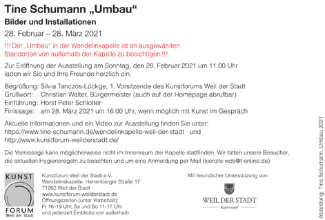 Weitere aktuelle Informationen und ein Video zur Ausstellung finden sich unter https://www.tine-schumann.de/wendelinkapelle-weil-der-stadt